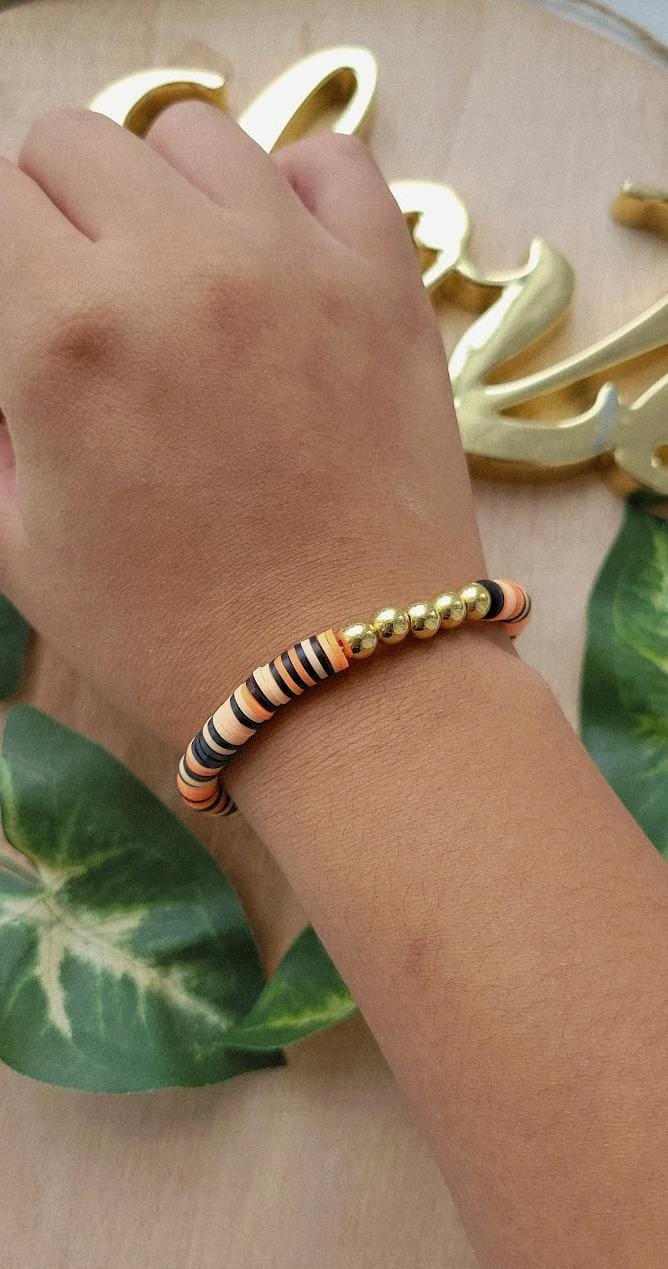 Embrace the coziest parts of the season with our handmade Pumpkin Spice Bracelet! This piece is a true celebration of fall, featuring a delicious mix of classic pumpkin orange and rich, spiced black beads that are beautifully finished with sparkling gold accents. Perfectly sized at 6.75 inches, it's the ultimate accessory to add a touch of warmth and vibrant charm to your autumn look